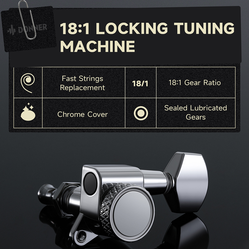 7-hangszín választó rendszer ThunderForge hangszedőkkel: Egy független kapcsolóval könnyen elérhetők a 7 hangszín opció. Egytekercses módban klasszikus hangzást biztosít kivételes tisztasággal. A DST-550 DONNER ThunderForge hangszedőivel rendelkezik, kapcsolható humbuckerrel és két single coil-lal. Tartalmaz egy kétpontos locking tremolót is, amely sokoldalú játékot tesz lehetővé, könnyed átmenettel a klasszikus, blues hangzástól a modern high-gain hangzásig.